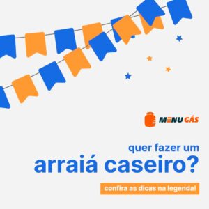 Que tal se inspirar para decorar sua casa e fazer seu próprio Arraiá? A Menu Gás também te ajuda com isso! Sim, vamos te dar algumas dicas para fazer uma decoração linda. Por exemplo, o chapéu de palha é um adereço que pode ir na cabeça, mas também pode ser usado na decoração da mesa. Para usá-lo, basta dar um toque, colocando um paninho bonito dentro dele e pronto, pode encher o chapéu com salgadinho, pé de moleque ou o que preferir! Outra dica é usar e abusar do papel crepom. Com ele, você faz decoração e também consegue moldá-lo na forma que você quiser e usar como saquinho pra pipoca, por exemplo. Alegria garantida pra toda a família, com comidas deliciosas e aquele clima de Arriá de verdade. Compartilha com os amigos pra ninguém perder as dicas.